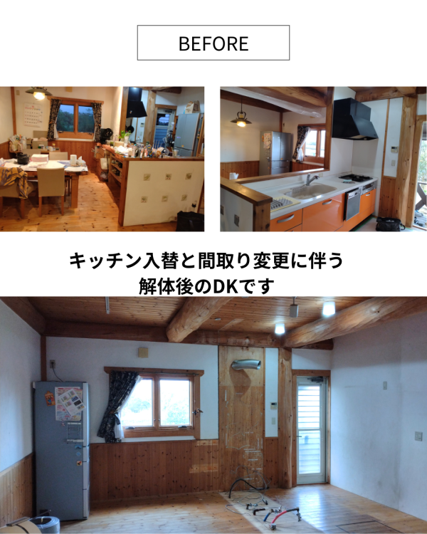 K様邸では、キッチンの入替とあわせて、DKの一部間取り変更も行いました。