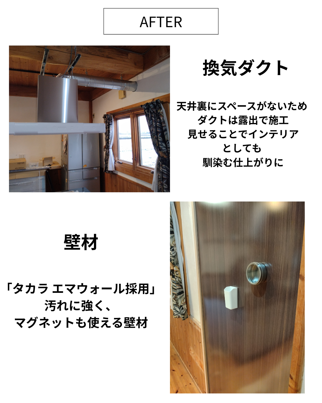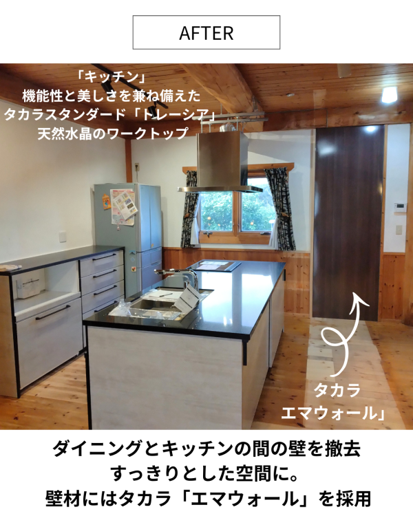 K様邸|キッチンリフォーム・間取り変更・DKリノベーション事例 鈴鹿市 暮らしに合わせて、使いやすく整えたDK空間 K様邸では、キッチンの入替とあわせて、DKの一部間取り変更も行いました。 キッチンには、タカラスタンダードの「トレーシア」を採用。 ワークトップには天然水晶(クォーツストーン)を選び、耐久性と美しさを兼ね備えた仕様としています。 また、天井裏に十分なスペースが確保できなかったため、ダクトはあえて露出で施工。 機能面だけでなく、空間のアクセントとしても馴染むデザインに仕上げました。 さらに、ダイニングとキッチンの間にあった壁を撤去し、空間をすっきりと一体化。 壁材には、ホーロー製のタカラスタンダード「エマウォール」を採用しています。 汚れやにおいが付きにくく、マグネットも使用できるため、 見た目と実用性を両立したDK空間となりました。 AFTER BEFORE 画像クリックで拡大します